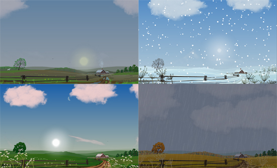 1. Picture reflecting actual weather - clouds, rain/snow, grass swaying with the wind, fog, thunderstorms.